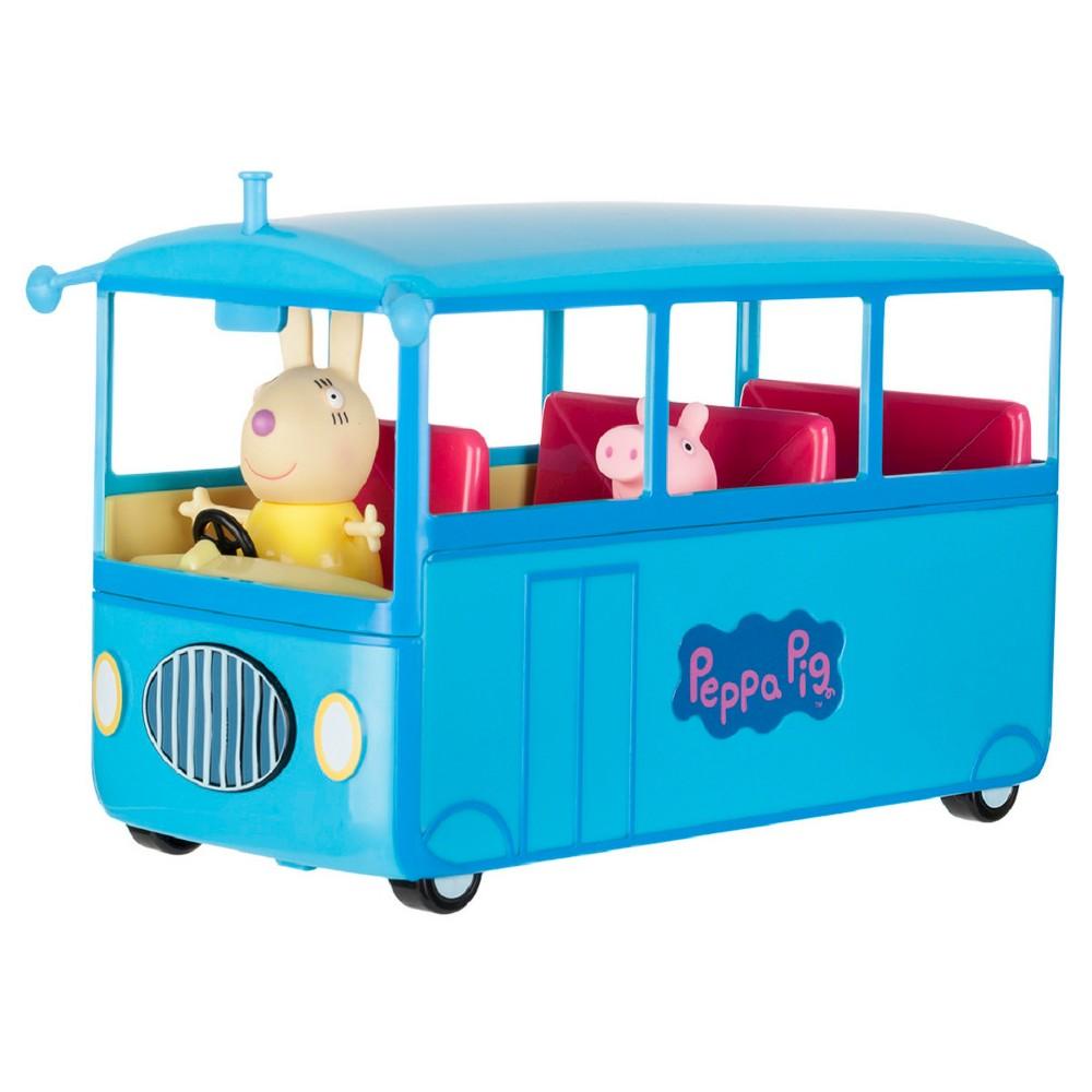 Come on a school bus trip with Peppa Pig! Miss Rabbit is ready to take Peppa and friends on a school bus adventure, where they'll sing their favorite bus song, the Bing Bong Song!The roof is removable, allowing for easy access on and off the bus. The fun keeps going, with multiple school bus sounds and Miss Rabbit's phrases. All aboard!
