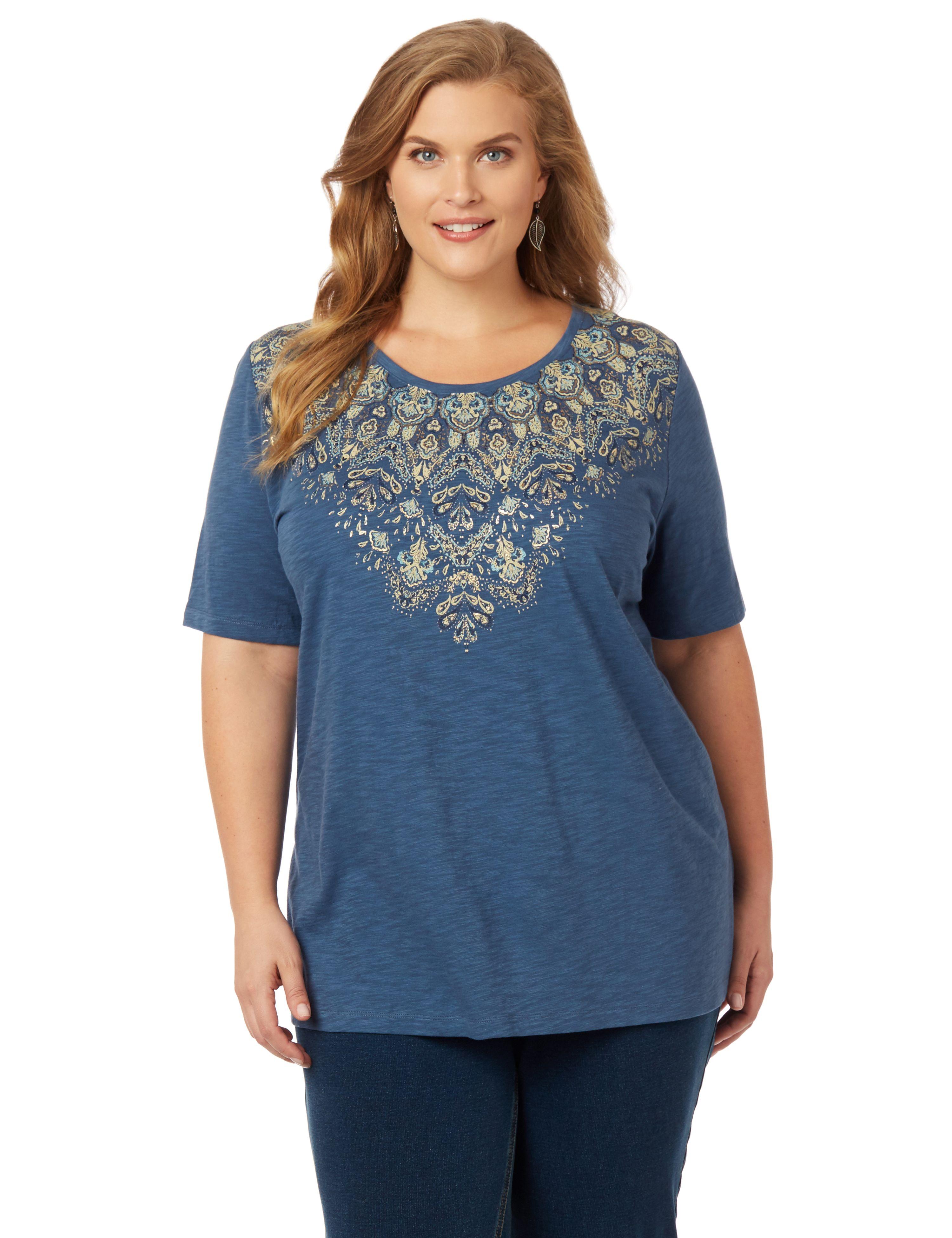 A glowing golden design lights up the scoop neckline of this soft slub knit top. Pair it with any of our jeans for a comfortable weekday or weekend look. Solid back. Short sleeves. Item Number #310974, 100% Cotton, Machine wash, Imported, Regular, 31" long. Petite, 29" long, Plus Sizes 0X-5X, Petite Plus Sizes 0XWP-3XWP, By Catherines Plus Sizes