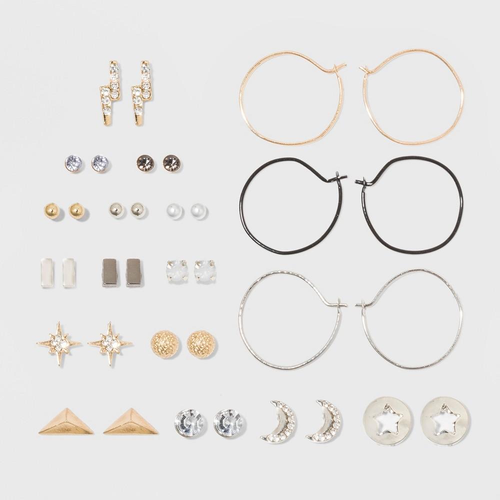 No matter what look you're trying to create, the Stones and Crescent with Hoops Earrings Set from Wild Fable has the finishing touch you need. The ball and bar metal studs complement your everyday looks, while the rhinestone stud earrings and lightning bolts and crescent moons with pave stones add a little sparkle. Slip on the small hoop earrings when you want to add some movement to your look. Color: Multi-Colored. Gender: Female. Pattern: Solid.