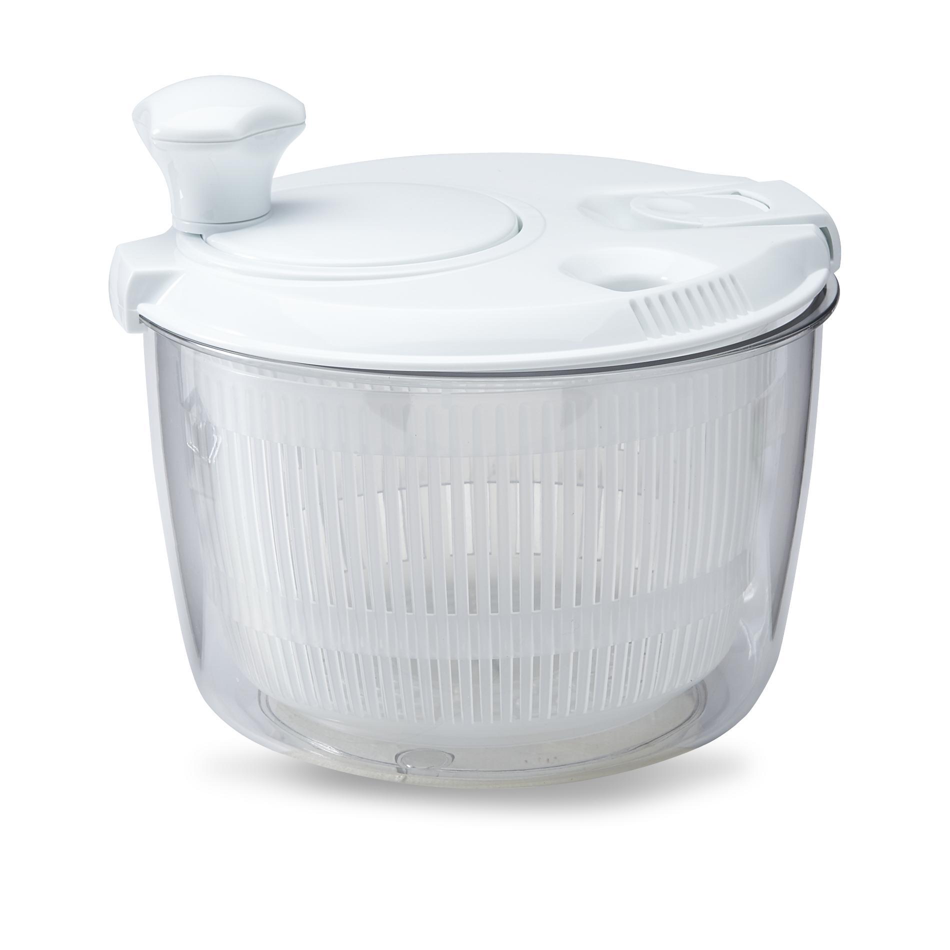 Making the perfect salad is quick and easy when using this salad spinner from Essential Home. The snap-on lid stays put as you use the easy-grip handle to spin your freshly washed veggies dry. Enjoy the crispness of your favorite ingredients perfectly coated with dressing using the convenient dressing pour hole. When your salad is complete, use the clear bowl to present the finished product. Color: White.
