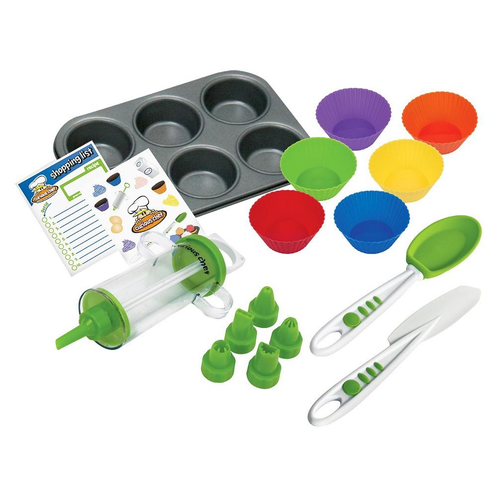 This 16-Piece Cupcake Decorating Kit from Curious Chef helps you teach your kiddo what cupcake-making is all about ??with tools designed especially for them. The set includes a six-cup muffin and cupcake pan, reusable cupcake liners, a mixing spoon, a frosting spreader and a kid-friendly frosting dispenser with side handles, a pump top and six decorating tips. The kit also includes stickers and a shopping list for even more fun. Color: White/Green.