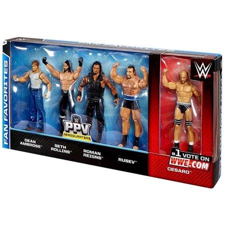 WWE exclusive Fan favorites action figure set comes with Dean Ambrose, Seth Rollins, Roman Reigns, Rusev & Cesaro. Here comes a high-thrills pack of WWE Superstar figures! Big on attitude and ready to do damage, they include the most popular WWE Superstars. Fans, get amped for high-action with all of your favorite Superstars together in one great pack.