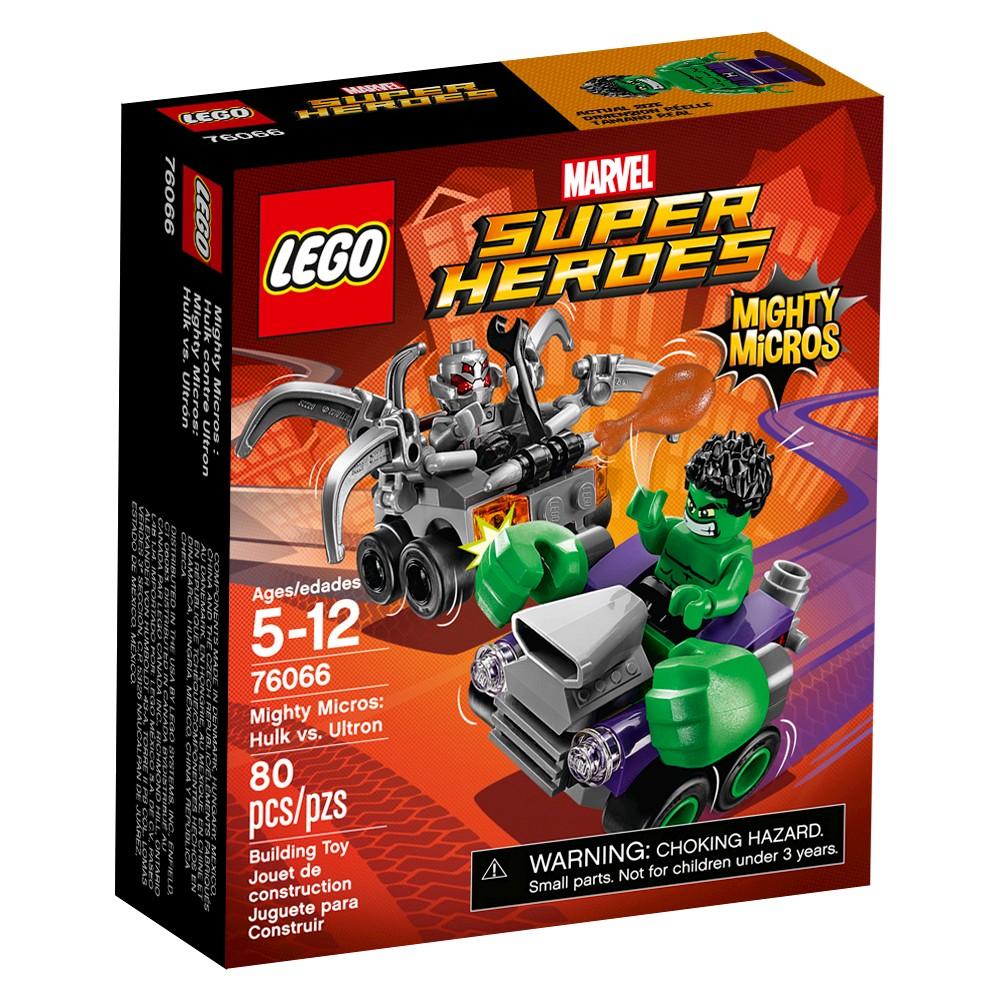 Drive into a Hulk vs. Ultron Mighty Micros battle! Role-play a fun Mighty Micros battle between Hulk????s vehicle featuring big green Hulk fists, and Ultron????s vehicle with posable tentacles. This fun set for young super heroes includes Ultron????s wrench and a chicken leg for Hulk. Includes 2 minifigures with mini legs: Hulk and Ultron. Gender: Male.