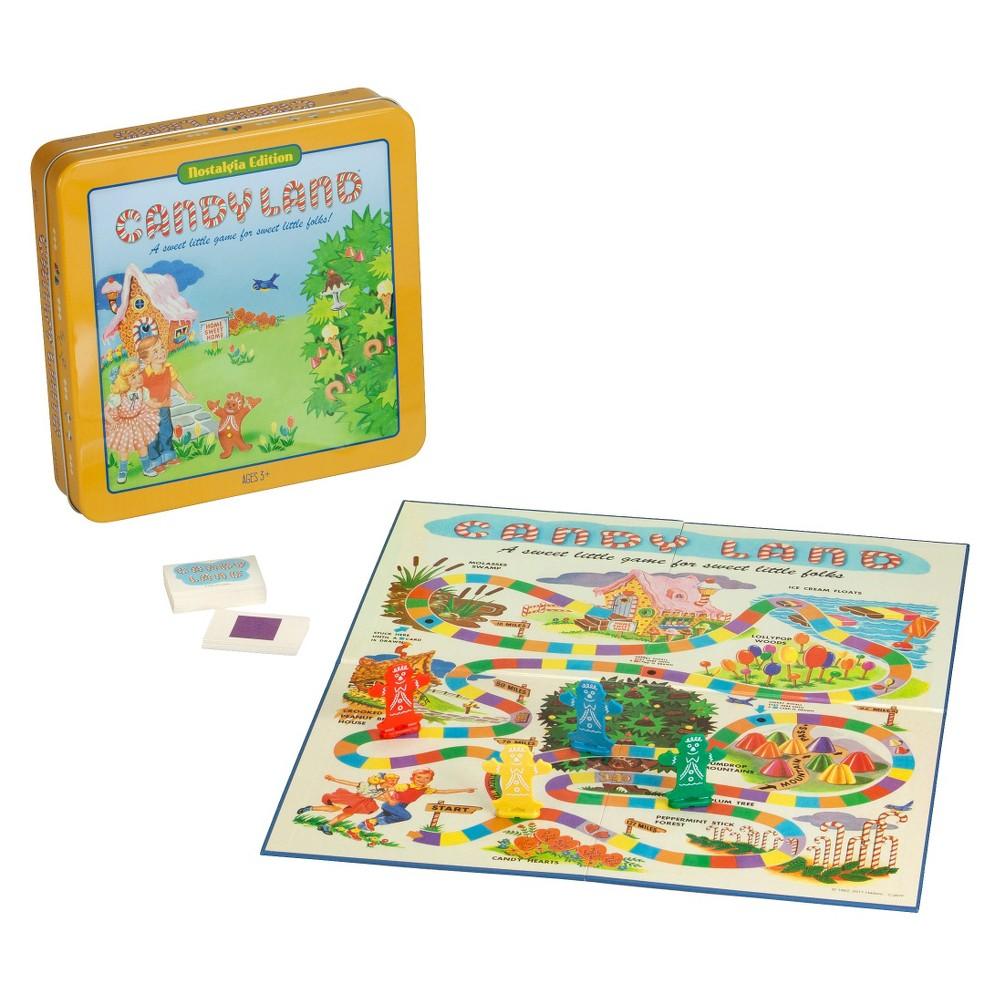 Retro Candy Land board gameDecorative tin box features built-in storageVintage 1962 edition game and cardsComes with 4 gingerbread men player tokensOverall dimensions: 10.5L x 10.5W x 2.25H inches. Relive your childhood with the Candy Land Nostalgia Tin. This old-fashioned version of everyone's favorite children's game is modeled after the original 1962 design. All of your favorite characters are here and the frosted gingerbread men are ready to walk the rainbow road. Even the playing cards are 100% vintag...