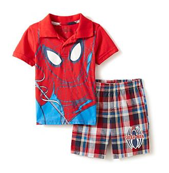 X This two piece outfit from Spiderman features a large graphic print with his favorite super hero! Cotton Two piece set includes shirt and shorts Shirt: polo collar, short sleeves, graphic Spiderman print Shorts: stretch waist, plaid, Spiderman logo on left leg Imported
