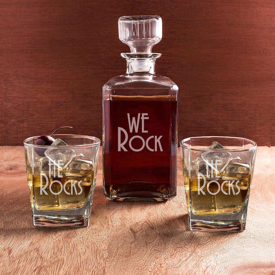 The 3-Count He Rocks Wedding Decanter and Glass Set is the perfect addition to your home bar. The clear glass barware set includes a 34-ounce decanter with "We Rock" and two 10.5-ounce rock glasses with "He Rocks" etching for a distinctive-cool look. So, go ahead and enjoy home entertaining or serving dashes of your favorite whiskey on the rocks with this classic glass decanter set, and when the party is over, simply stow them in your dishwasher for a quick cleanup.