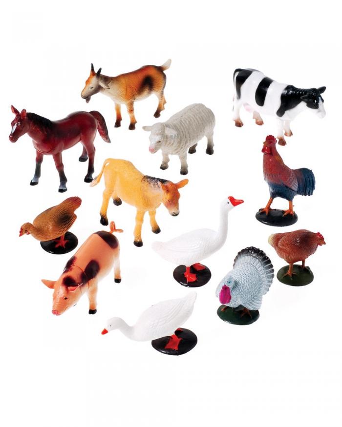 Size 3 inches to 5 inches Long Made of plastic Assorted Styles: Sheep, Horse, Goat, Duck, Chicken, Turkey, Cow, and Pig
