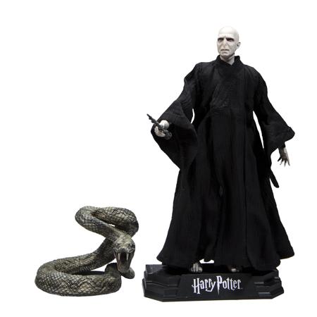 Incredibly detailed 7 scale figure of Lord Voldemort. Features Lord Voldemort based on his outfit from Harry Potter and the Deathly Hallows Part 2. Figure comes with base, background artwork, fabric robes, Elder Wand, and Nagini the snake. Nagini stands approximately 2tall and 2 wide but can be adjusted to be taller. Character specific background artwork is removable from package and attaches to the base. Designed with Ultra articulation with 22 moving parts.