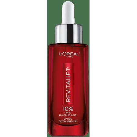 L Oreal Paris Revitalift Glycolic Acid Peel Serum L Oreal Paris Revitalift Derm intensive 10% pure glycolic acid Serum is a nighttime dark spot correcting face serum used to visibly even skin t1 and reduce wrinkles. This glycolic acid dark spot Corrector face serum is validated in partnership with dermatologists. Glycolic acid is an Alpha hydroxy acid (AHA) that has been used by dermatologists for decades to resurface exfoliate brighten even out the skin t1 and even help de-clogging the pores that can help reduce acne. Revitalift Derm intensive 10% pure glycolic acid Serum is also formulated with Aloe plant-derived/botanical extract renowned for its soothing benefits