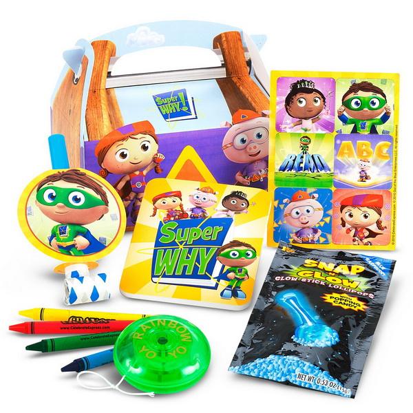Calling all Super Readers! To the Book Club! Each box includes: Super Why! sticker sheet*, Snap N Glow Lollipop, Super Why! notepad*, box of 4 crayons, assorted rainbow yo-yo, and Super Why! blowout*. Some ADULT assembly required. One or more of the party favors included in this favor kit may be substituted with an item of similar quality due to availability. This product is officially licensed ??2010 Out of the Blue Enterprises LLC.