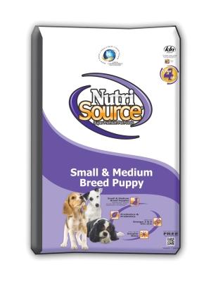 NutriSource Small & Medium Breed Puppy Dry Dog FoodFamily-owned-and-operated NutriSource Super Premium Pet Foods has been manufacturing high quality pet foods for more than 50 years. NutriSource Small & Medium Breed Puppy Chicken & Rice Formula uses the company s Good 4 Life System of natural elements for optimum health and well being. Designed to meet the nutritional needs of puppies NutriSource Small & Medium Breed Puppy Formula s first two ingredients are chicken meal and chicken high quality sources of protein for strong muscles.Small for little jaws this delicious easy-to-digest kibble also contains brown and white rice vitamins minerals prebiotics probiotics and omega fatty acids with DHA. NutriSource Small & Medium Breed Puppy Formula has a proper blend of nutrients for puppies development.Ingredients: Chicken meal chicken brown rice white rice chicken fat (preserved with mixed tocopherols and citric acid) menhaden fish meal (a source of fish oil) oatmeal flax seeds beet pulp-dried s