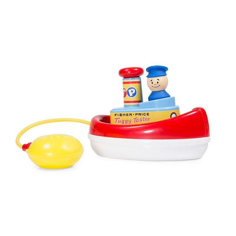 First introduced in 1967 the Tuggy Tooter quickly became a memorable toy from childhood. Squeeze the life preserver and watch the smoke stack go up and down and make a toot-toot sound. The boat has a non-removable captain figure. All aboard for this delightful water toy!