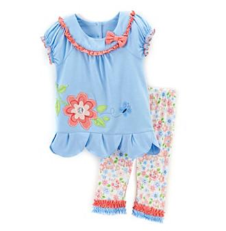 X This charming two piece outfit set includes a scalloped trim chambray top and floral print leggings. Cotton Two piece outfit set includes tunic top and leggings Tunic: ruffle neckline with bow applique, short sleeves, floral and butterfly, applique, chambray, scalloped hemline Leggings: stretch waist, allover floral pattern Imported
