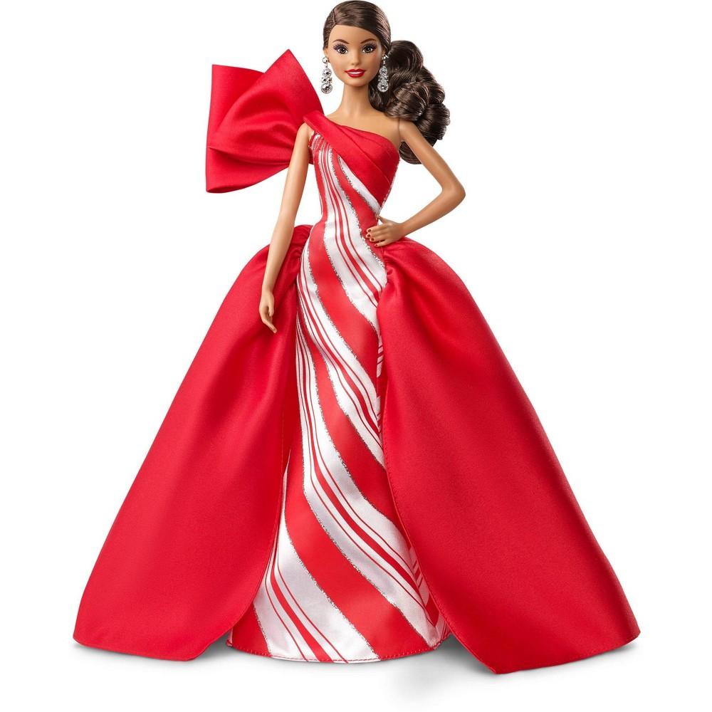 For decades the Holiday Barbie doll has embodied the spirit of a season marked by wonder and celebration. 2019 Holiday Barbie doll shines in an elegant gown with red and white holiday print and silvery sparkle detail. A beautiful bow adorns the gown s shoulder and complements a dramatic red train. Her brunette curls are styled in a ponytail with a chic side part and silvery chandelier earrings complete the look. Tis the season to smile wider hug your loved ones a little tighter and savor that magical holiday spirit. Reflecting the sparkle and jubilation of holiday festivities 2019 Holiday Barbie doll is the definitive celebration of a season full of love. Includes 2019 Holiday Barbie doll doll stand and certificate of authenticity.