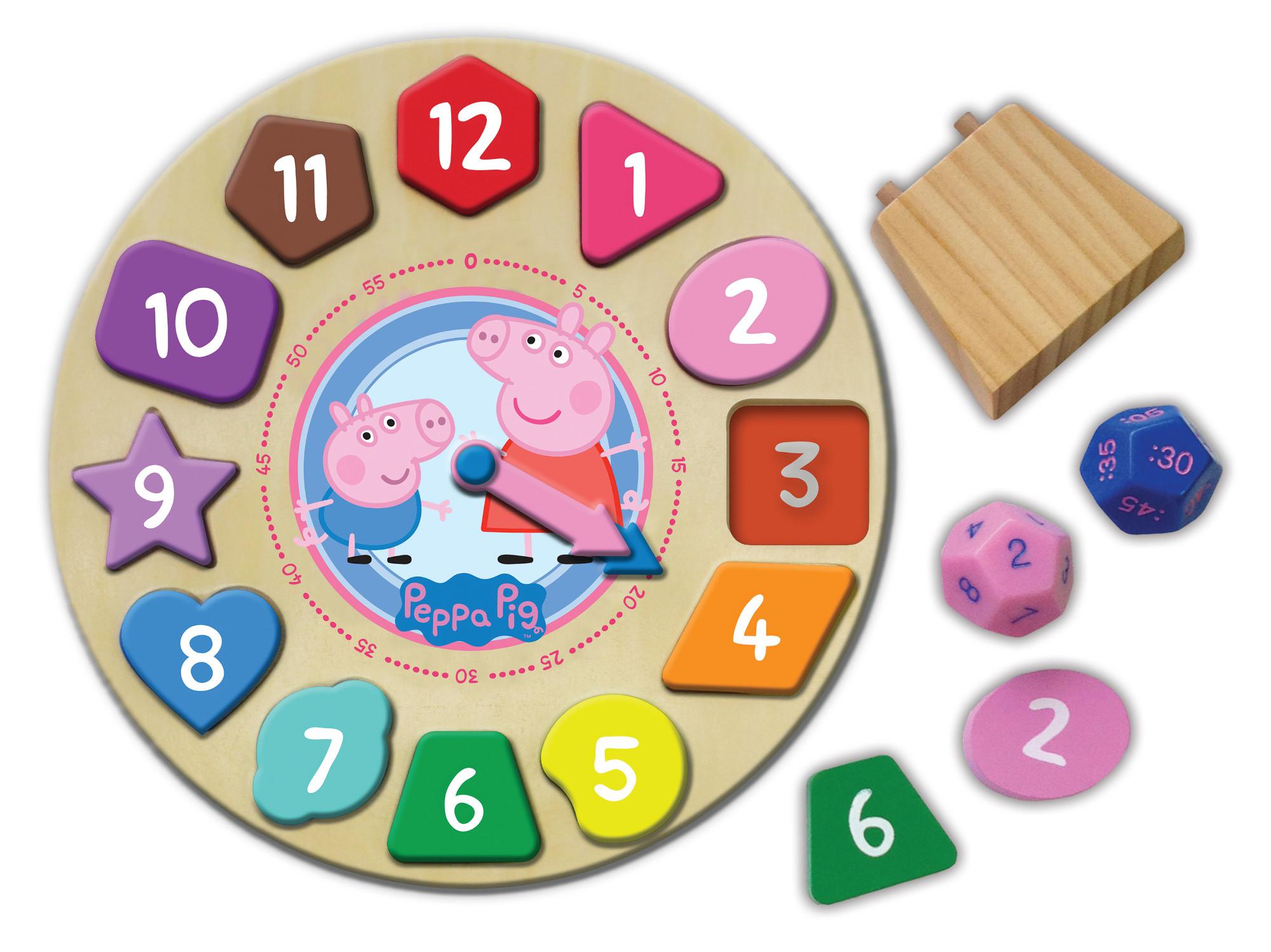 The removable brightly colored wooden shapes with numbers printed beneath the shapes allow for greater interaction and ease of matching With this shape sorter clock learning to tell time is made fun and simple! 12 die-cut wooden shapes clock face labeled with hours and minutes wooden clock stand and bright fun colors with smooth edges. Features Peppa Pig Shape Sorter Clock Puzzle 12 Piece - SKU: KMSH9958