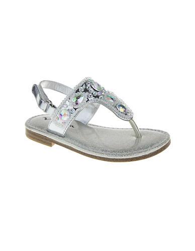 Crystal accents add a beautiful touch to these Abelina faux metallic leather sandals from Nina. Features beading and rhinestone details and a Velcro; strap.
