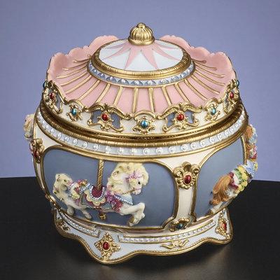 An extraordinarily beautiful carousel-themed musical box reminiscent of fine English creamware. The horse inside rotates to the music when the top is opened. Plays Carousel Waltz. Winds-up on the underside. Inside has cream-colored flock lining below the horse and beautiful gold-colored edging. The horse relief under the lid is behind a clear pane to create a shadow box effect. Finished all around, a total of four horses decorate the sides. Made of blue, pink, and cream tinted resin. Has a solid, heavy fee...