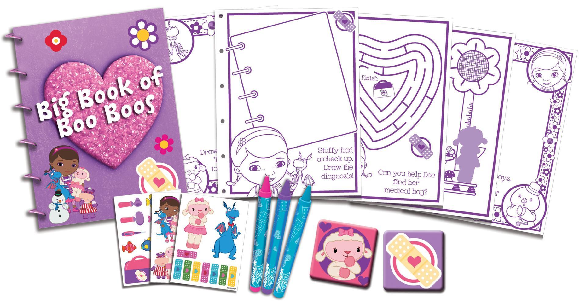 Find and diagnose what s wrong with your own toys with your very own Doc McStuffins Big Book of Boo Boos. It includes a 30 page sparkly book of Boo Boos just like Doc s and 2 self-inking stampers 3 sheets of stickers and 3 chunky crayons. This sparkle book is held together is a plastic spiral binding and makes an ideal gift anytime of the year for lots of fun and entertainment. Kids will love taking this on the go or using it at home for exciting work and play.