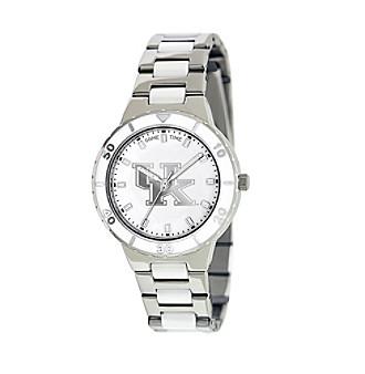 Don't miss a second of action thanks to this Kentucky Wildcats Ladies Pearl Watch, Made by Game Time. The Kentucky Wildcats Pearl Series Watch comes with 10 white ceramic beads on the bracelet. It's white bezel sparkles while it has a stainless steel cap-folded bracelet brass crown w/butterfly clasp. The watch has the accuracy and reliability of a Japan Quartz movement, and is water resistant to 3 ATM (99ft) and Game Time's Limited Lifetime Warranty Features: - Officially Licensed Team Logo, - Alloy case/W...