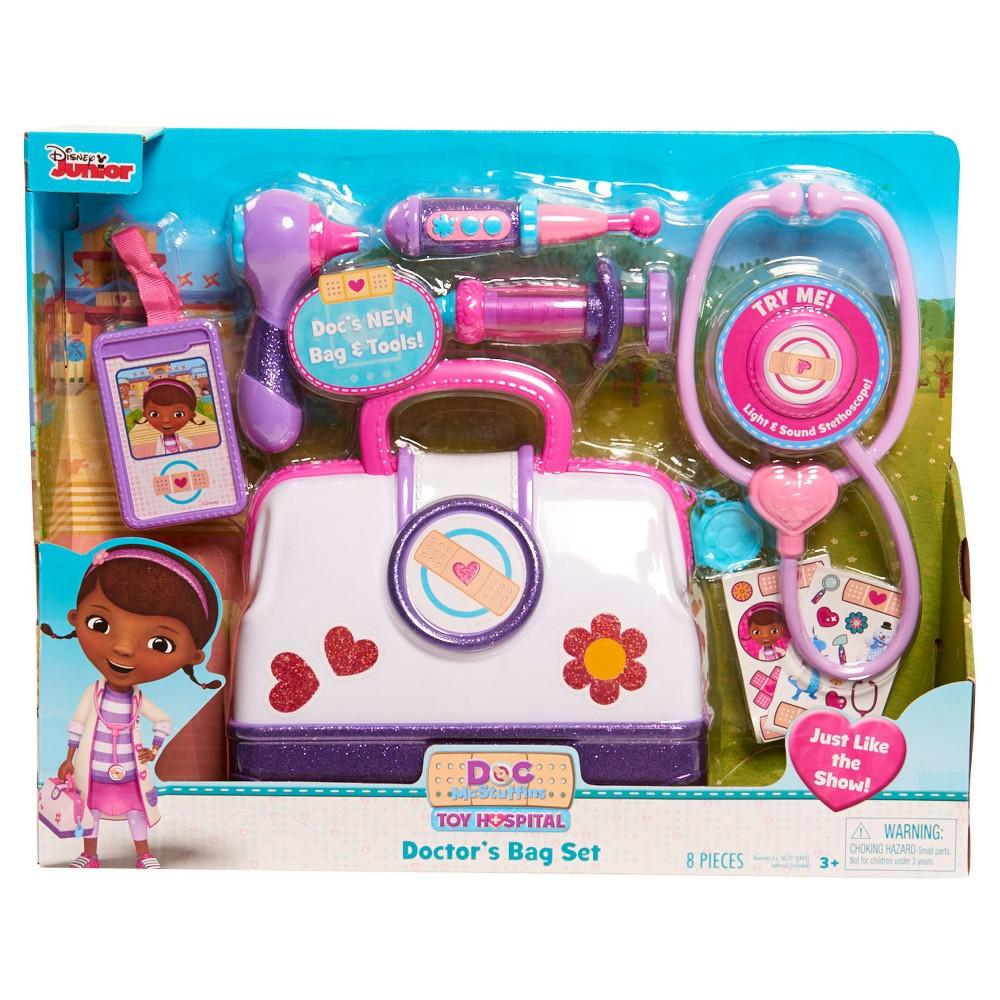 Keep Your Child's Stuffed Animals Healthy with the Disney Doc McStuffins Toy Hospital Bag Set With the Disney Doc McStuffins Doctor's Bag Set , your kid's plush toys can stay in top shape. Modeled after Doc McStuffins' own bag, this playset includes all the essential instruments for your aspiring doctor. Your little one can perform a routine checkup using the toy thermometer, otoscope and stethoscope. Even when it's time for a shot, the kit features a toy syringe and bandage stickers to make it all better....