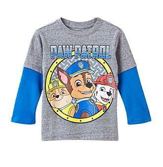 X Your little guy will enjoy wearing this twofer tee which features his favorite Paw Patrol characters on front. Cotton/ polyester Crew neck Twofer sleeves Paw Patrol character front graphics Imported