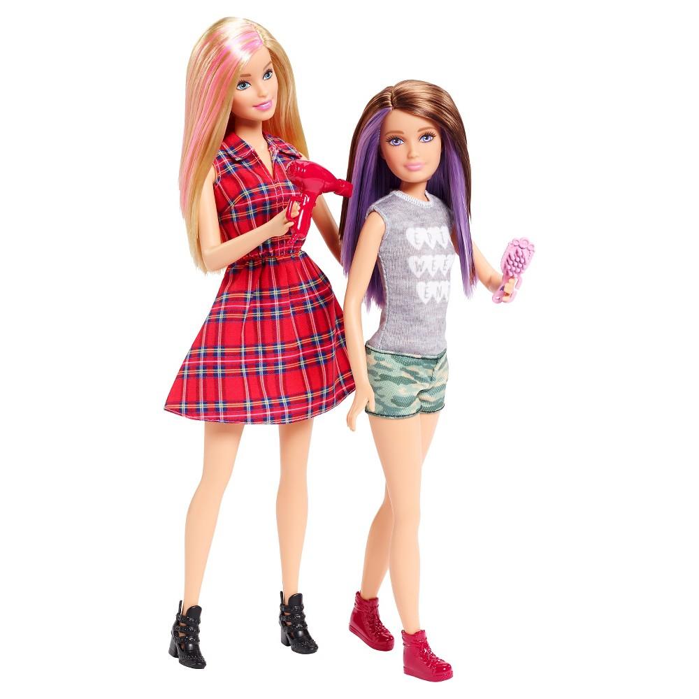 Barbie?? loves spending time with her sisters, and two dolls together help to celebrate the bonds they share together! Barbie?? and Skipper????doll are changing up their looks with hair styling fun! Each sports a colorful hair stripe -- Barbie?? doll has opted for pink and Skipper????doll for red. Each also wears a unique outfit with on-trend accents. Barbie?? doll looks fabulous in a stylish plaid dress with black booties; Skipper????is sporty in a decal tank shirt, patterned shorts an